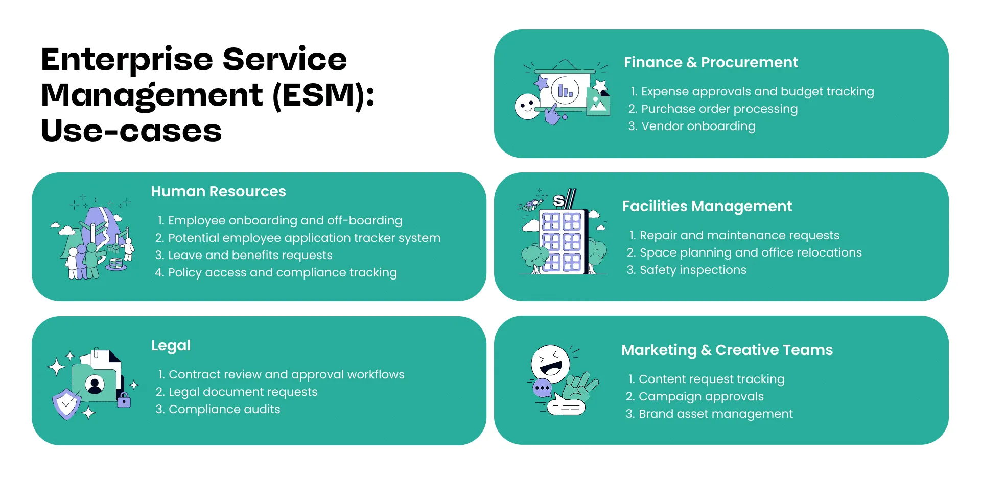 ESM takes the service management, structure, efficiency, and practices of IT Service Management (ITSM) and expands it to every internal service team — from HR to Finance to Legal. Think of it as giving every department a modern, streamlined way to deliver services to employees — with transparency, accountability, and less chaos.