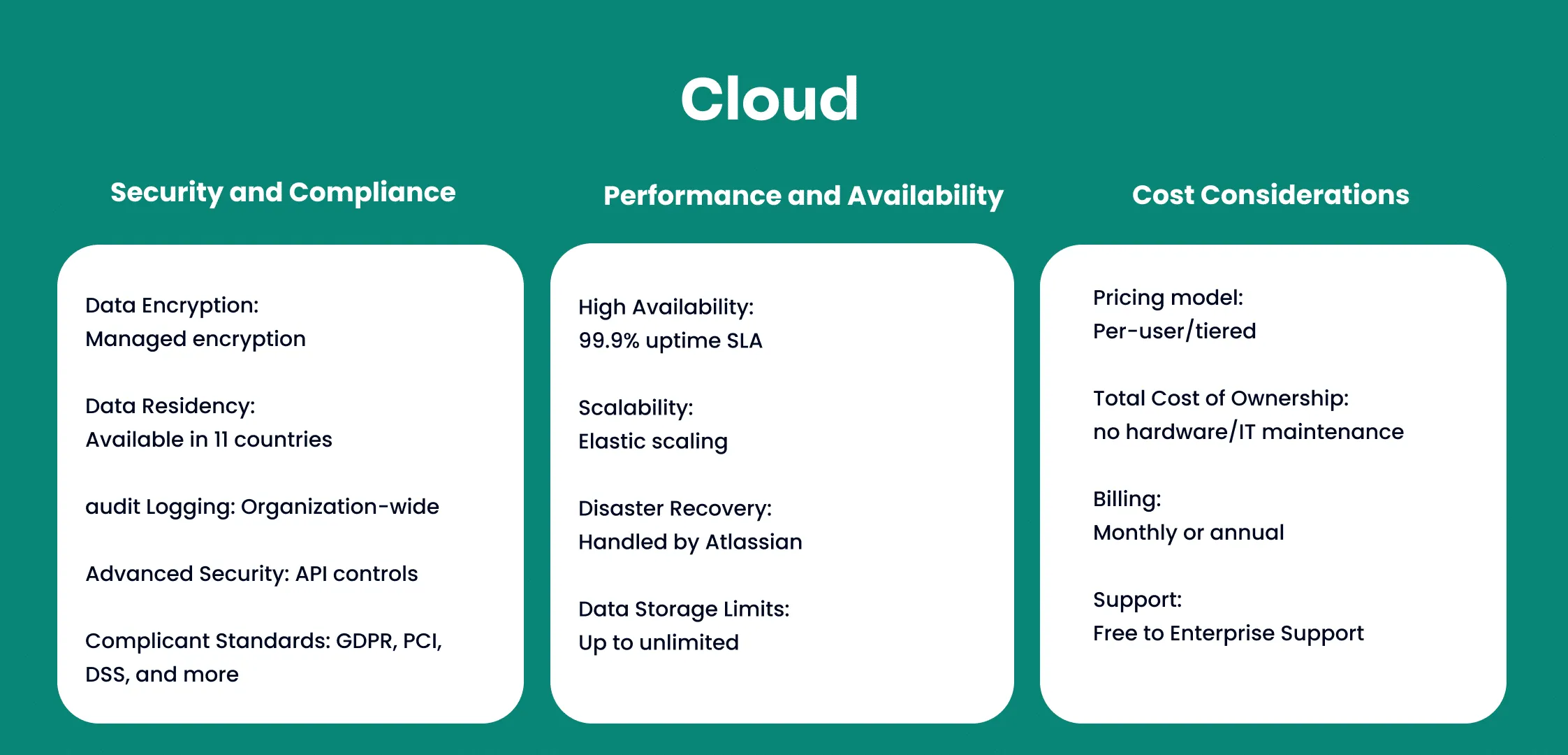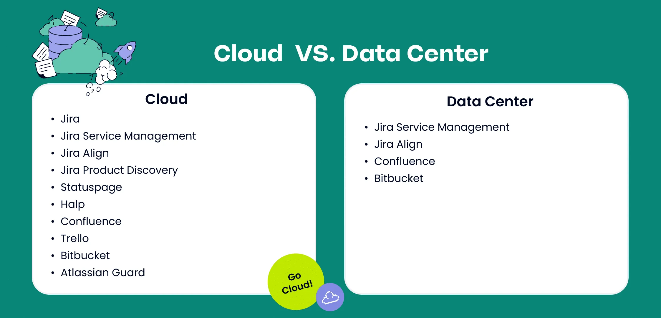 Choosing between Atlassian Cloud and Data Center depends on your organization’s unique priorities in terms of product availability, security, compliance, scalability, maintenance, and cost. For example, your organization may opt for Atlassian Cloud because it provides access to advanced tools like Jira Product Discovery, Statuspage, and Halp, which are not available on the Data Center platform.