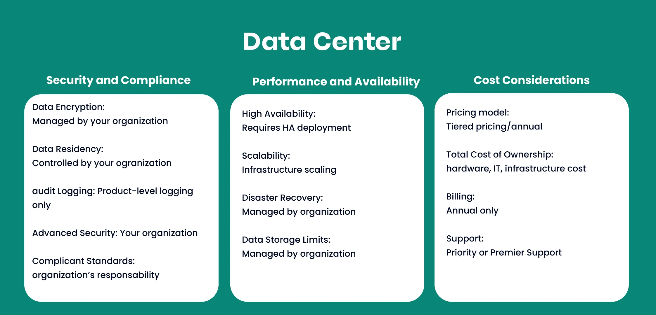 In contrast, Atlassian Data Center serves organizations with more stringent requirements for customization, compliance, or data residency. It is a self-managed environment ideal for those requiring granular control over system configuration, performance, and internal policies.