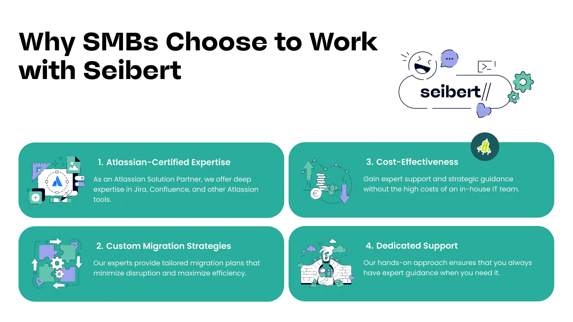 At Seibert, we specialize in helping small and medium-sized businesses get the most from their Atlassian tools. Our clients trust us because we offer: