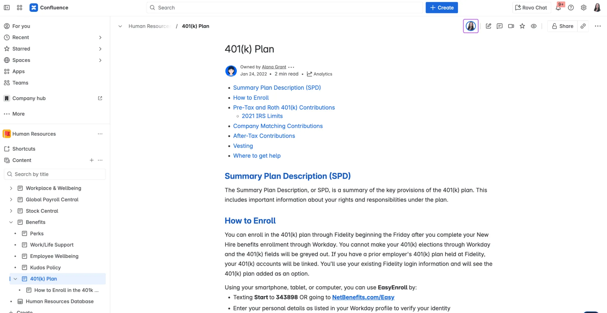 Example: 401(k) Plan Page in Human Resources (HR) Knowledge Base in Confluence