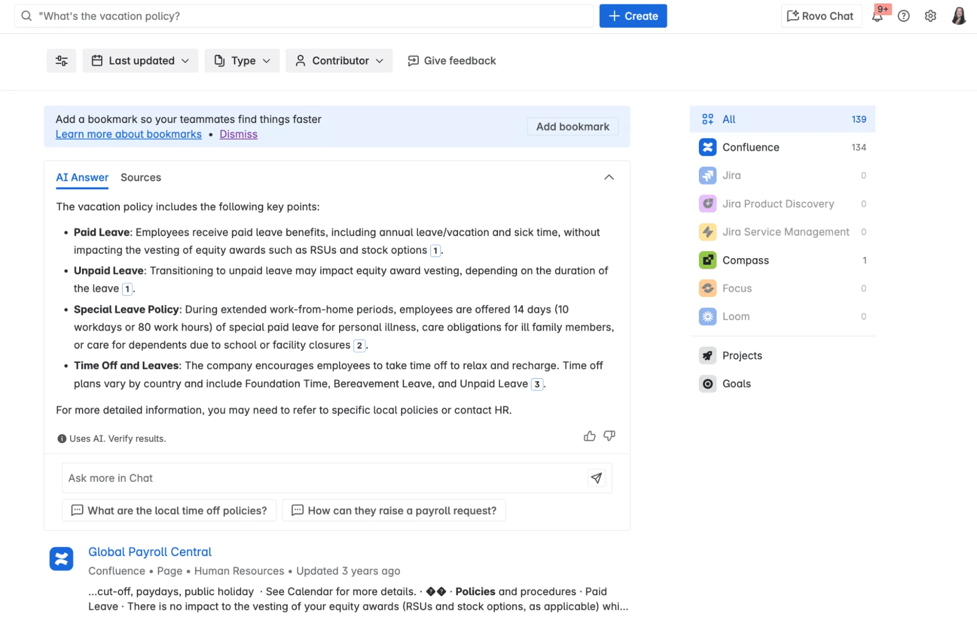 By promoting or searching for an answer to your question, Rovo surfaces with the most relevant pages or even answers directly in-line, using AI to understand context and intent, helping employees find what they need faster and reducing dependency on HR staff.