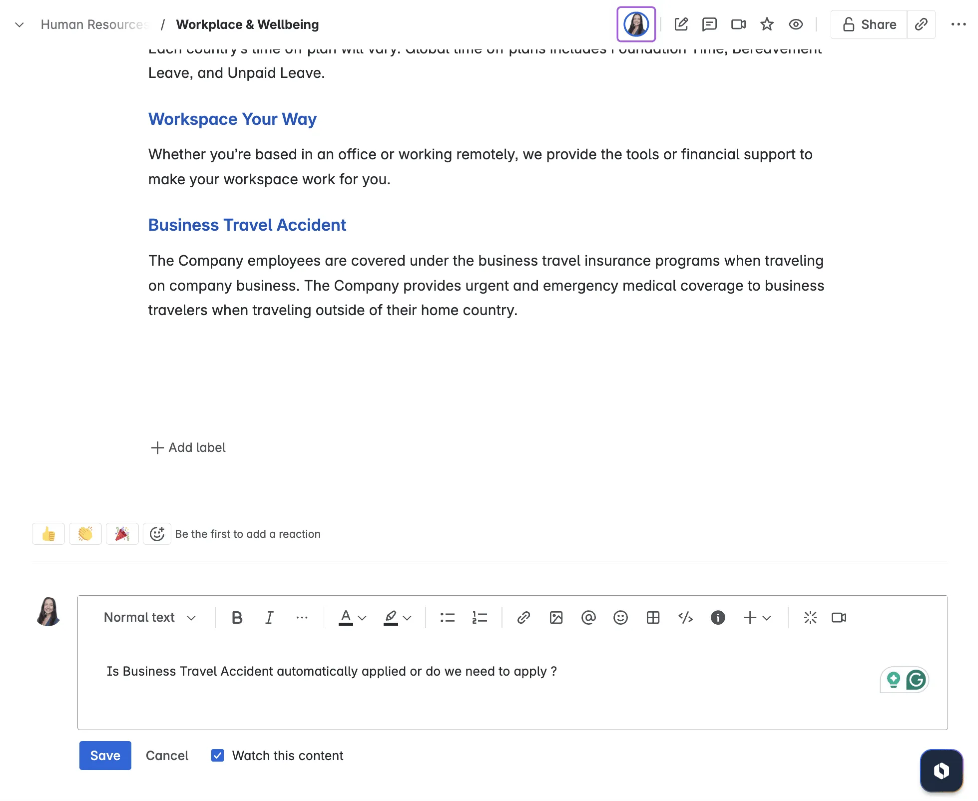 Example: Asking a question via Page comments in the Human Resource (HR) Knowledge Base in Confluence