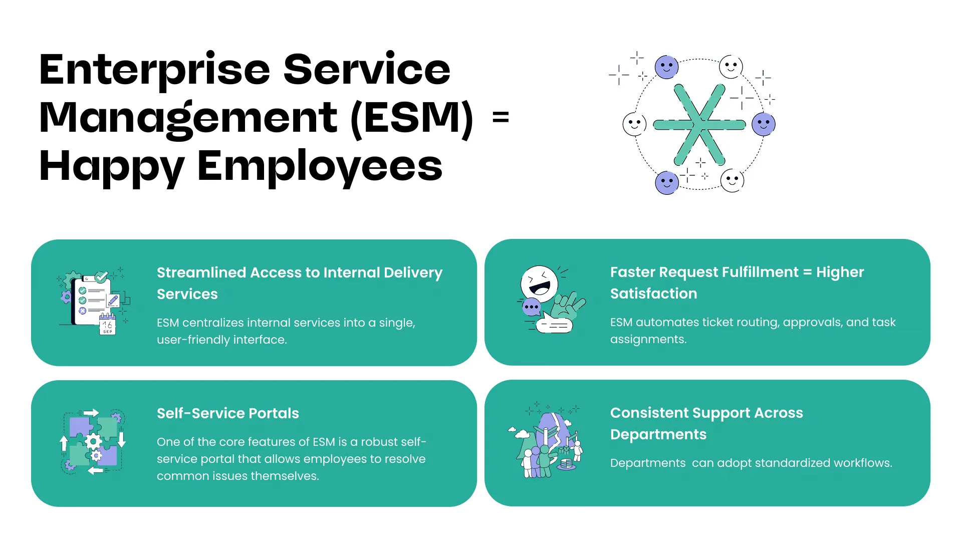 I’m sure we’ve convinced you already of the importance of a satisfying employee experience. In the sections ahead, we’ll explore how ESM drives these outcomes — and how your organization can put it into action. Let’s dive in.