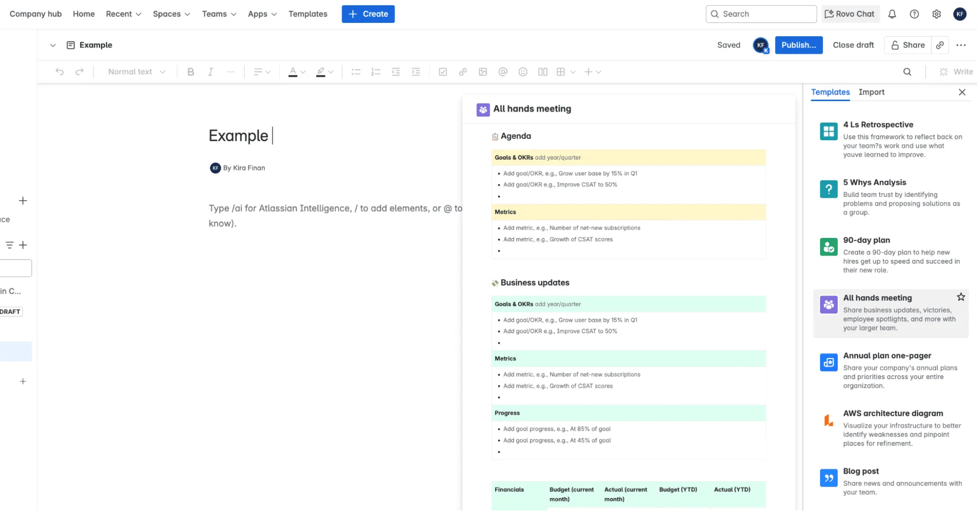 These tasks are made even easier with Confluence’s built-in templates. For example, the “All Hands Meeting” template lets you quickly capture agendas, business updates, action items, and more—ensuring everyone stays aligned, regardless of location.