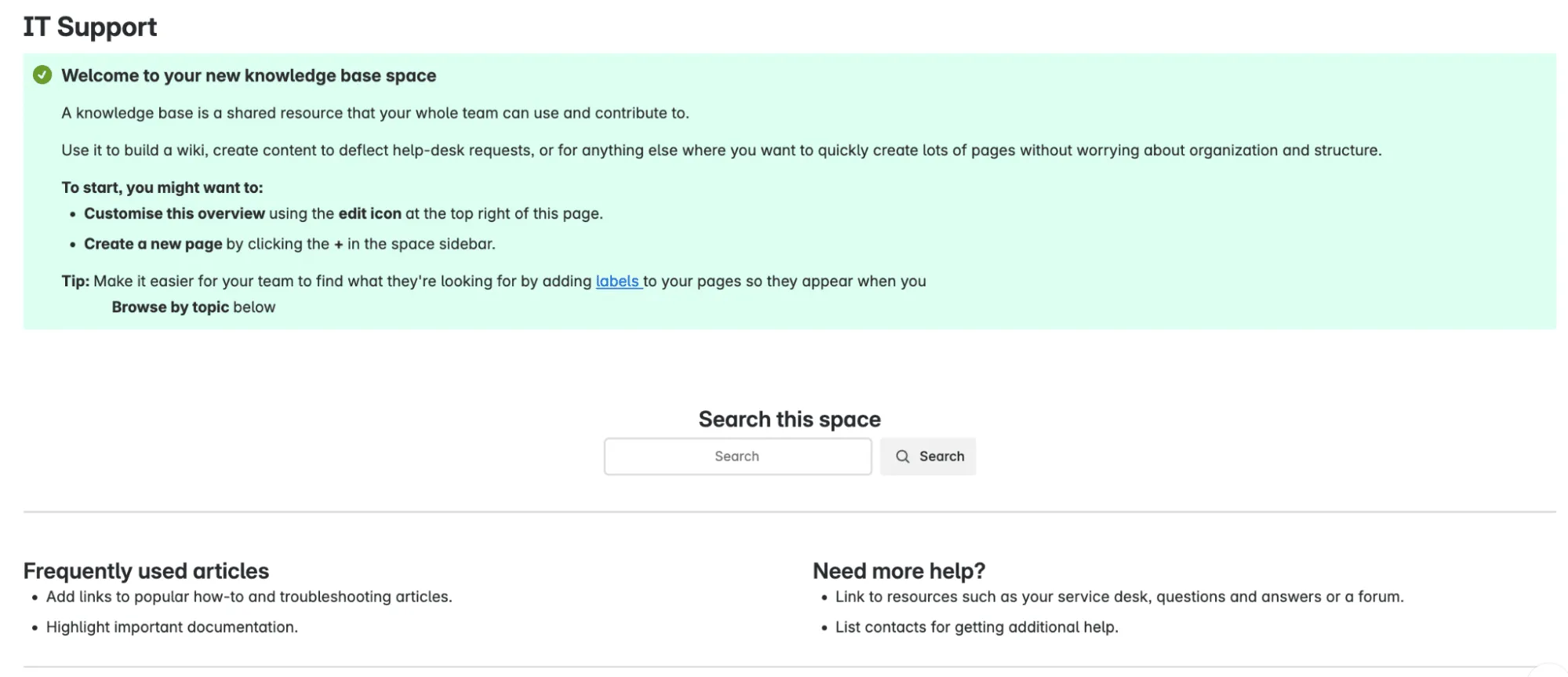 Once you’ve created your space, you can customize it further to suit your needs. Add a clear description, link to relevant projects or documentation, and include any additional pages or macros that make the space more functional and aligned with its purpose. Confluence gives you the flexibility to shape each space into a hub that truly works for your team.