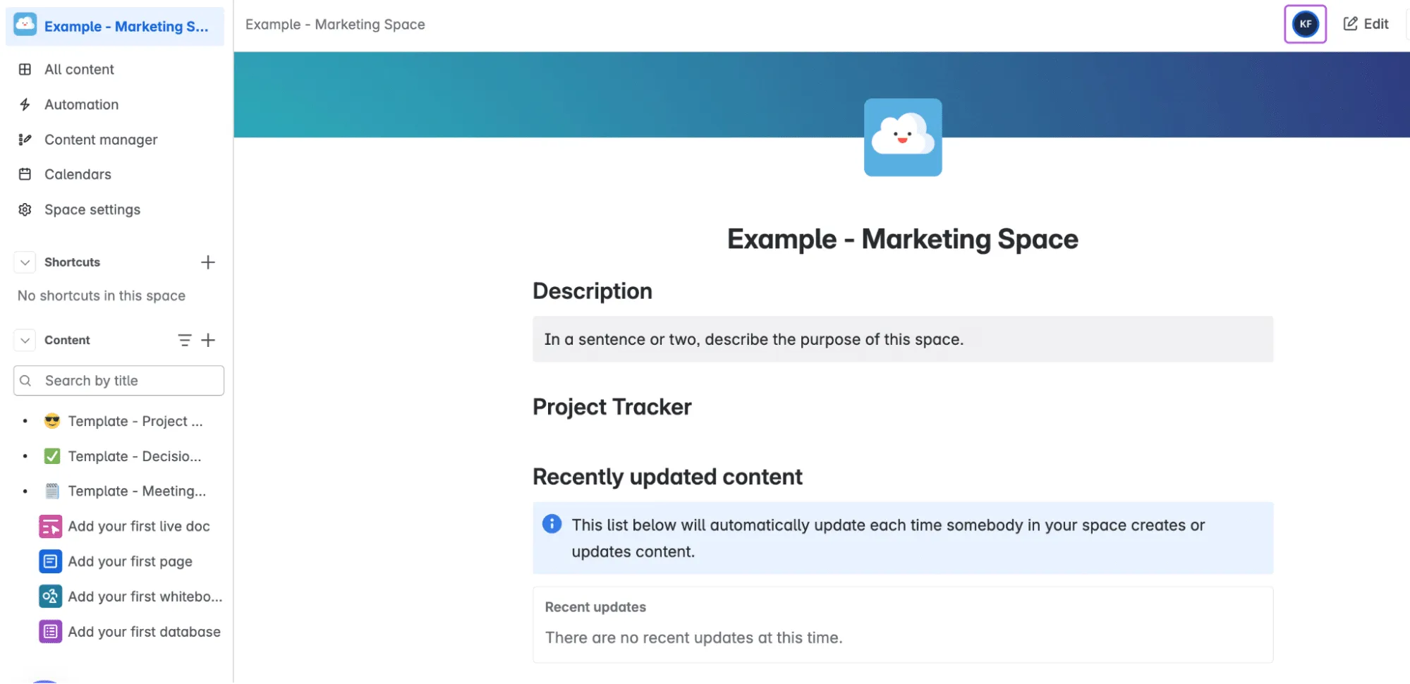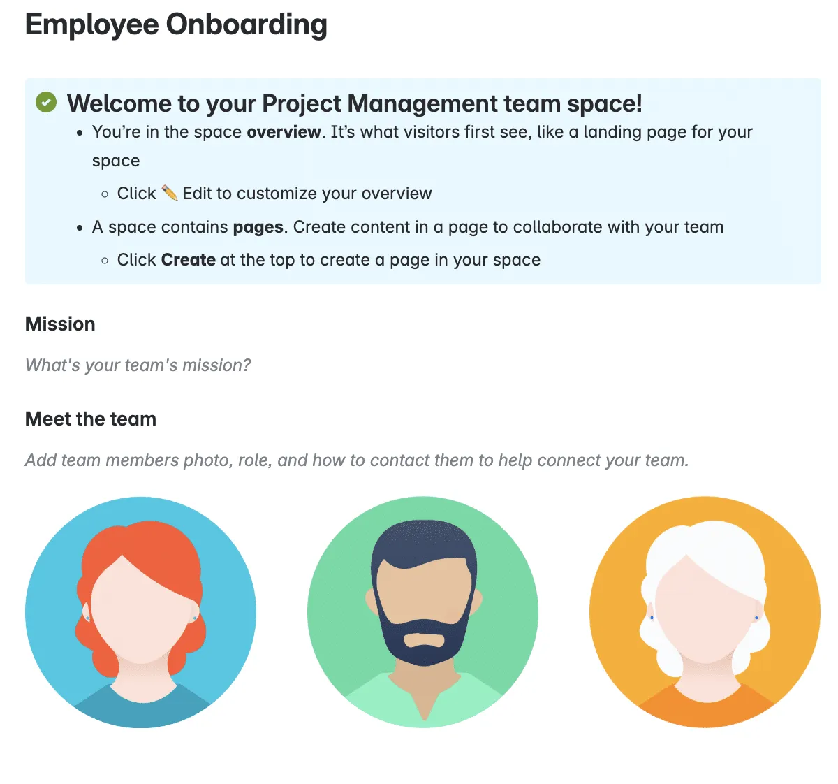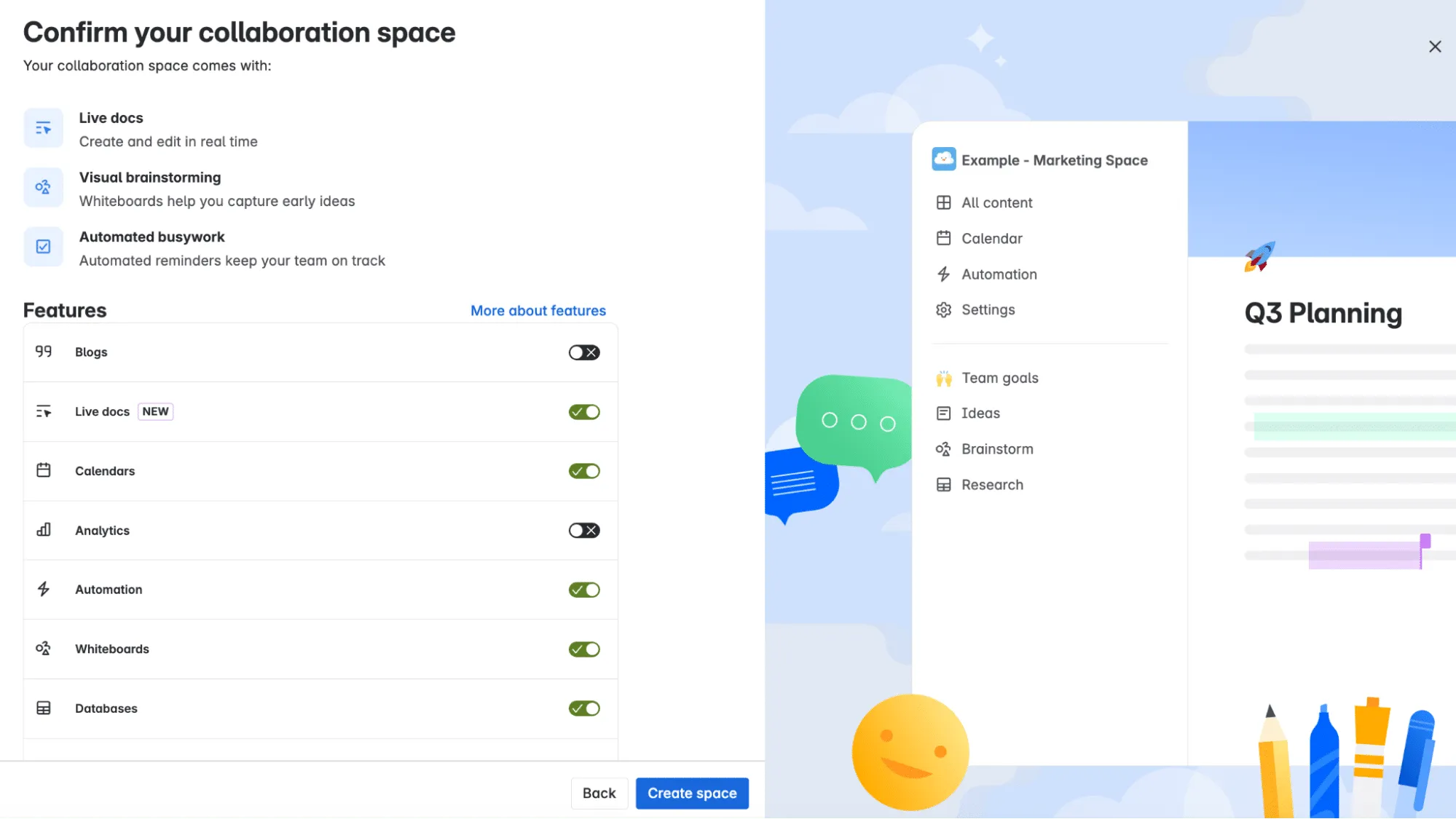 You can enrich your space with features like blogs, live documents, team calendars, and analytics—whatever your team needs to stay aligned and informed.