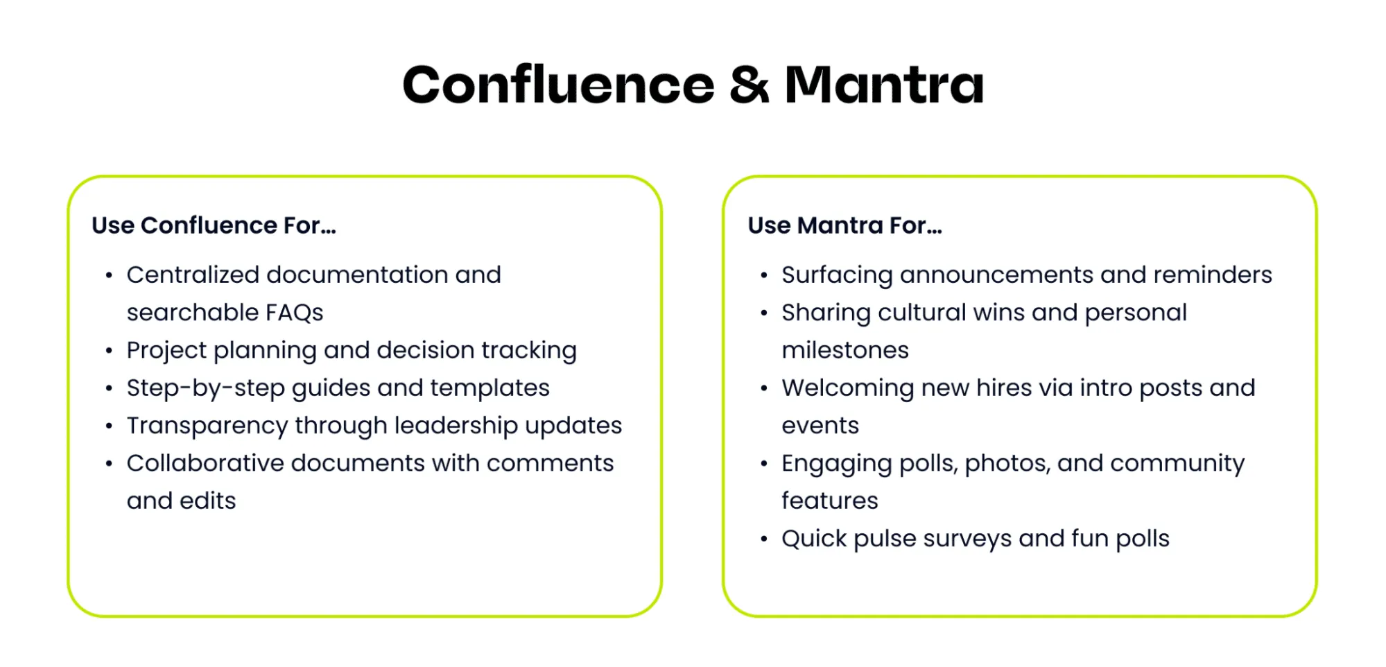 Used in tandem, Confluence and Mantra create a holistic remote employee experience: