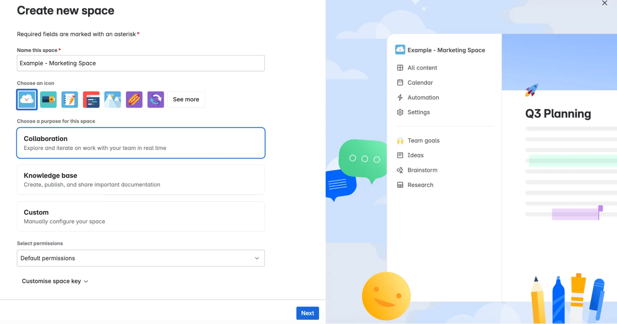 In Confluence, a space can be created for virtually any purpose. At its core, there are two predesigned space types available: one built for collaboration and another for knowledge management. Each space comes with a tailored structure based on its purpose. For example, a collaboration space includes prebuilt areas for team goals, ideas, brainstorming, and research—making it easy for teams to work together asynchronously.