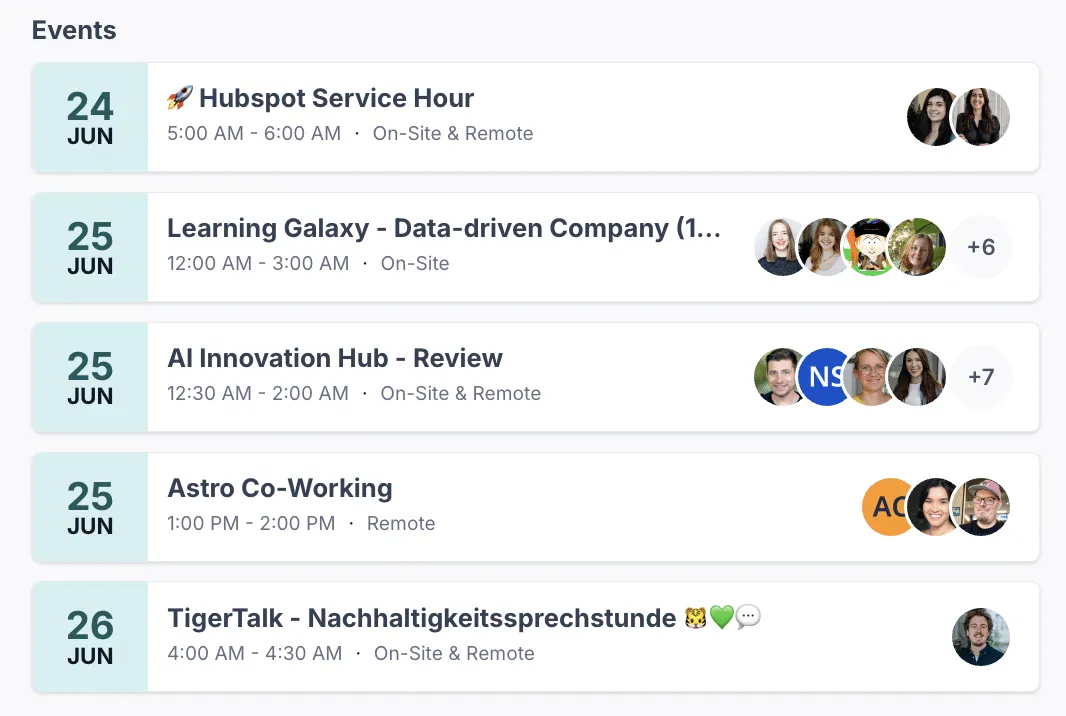 Whether it’s a quarterly town hall or a virtual coffee break, remote employees should never have to hunt for what’s happening. Use Confluence’s Team Calendars or embed Mantra’s event feed so employees can see and join events directly from the hub.
