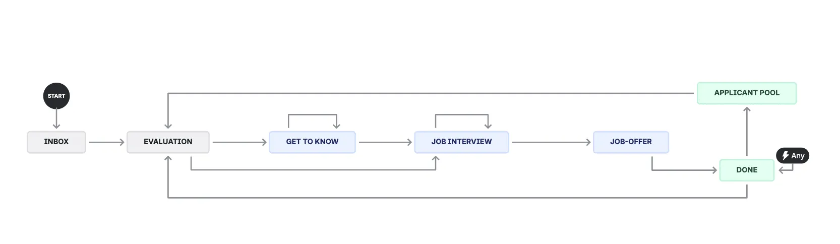 - Tailored workflows that adapt to your process: Customize workflows to match your specific recruitment pipeline stages, such as HR Screening, Interviewing, and Hiring.