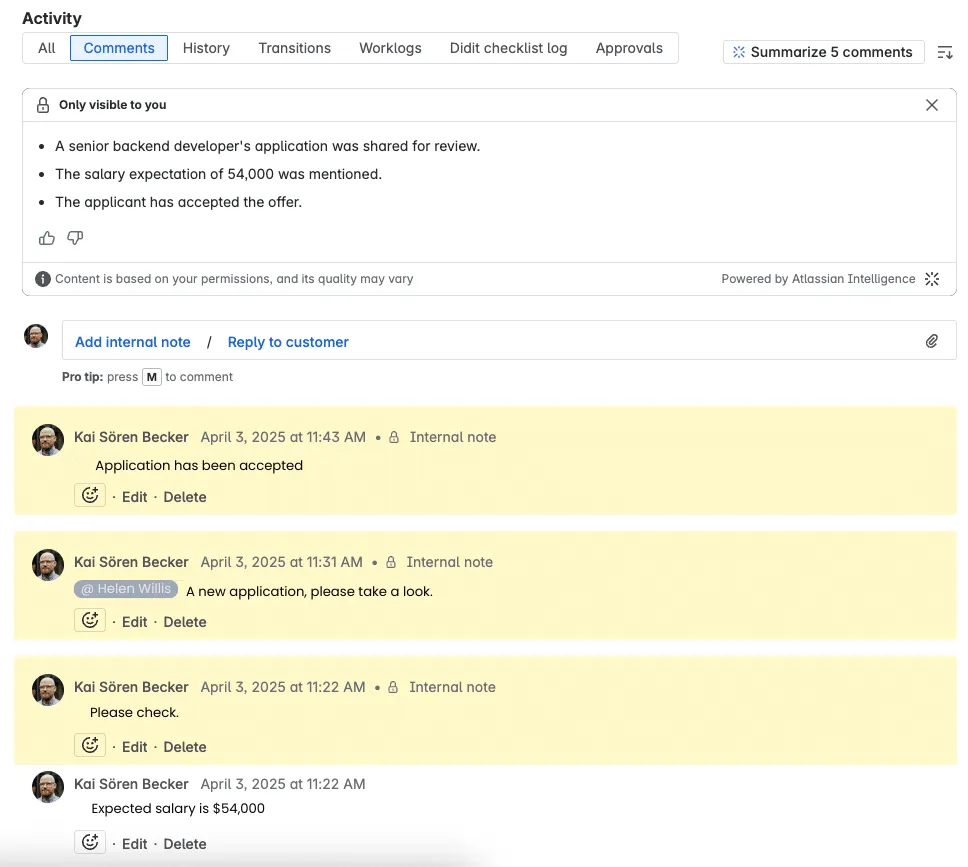 - Team Collaboration Made Easy: Facilitate internal discussions within JSM tickets by tagging stakeholders, attaching files, or adding notes. This ensures faster, more informed hiring decisions.