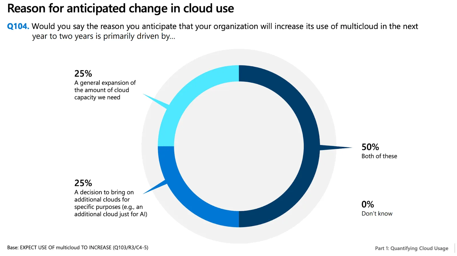 According to a study by Microsoft, nearly 80% of professionals are already moving to the Cloud, and this shift is driving performance improvements. Moreover, employees anticipate even greater multi-cloud adoption in the coming years. 25% of employees believe that Cloud technology adoption is propelled by expanding cloud capacity and 25% advancements like artificial intelligence (AI) ( Source: Microsoft) – and 50% believe it is both.