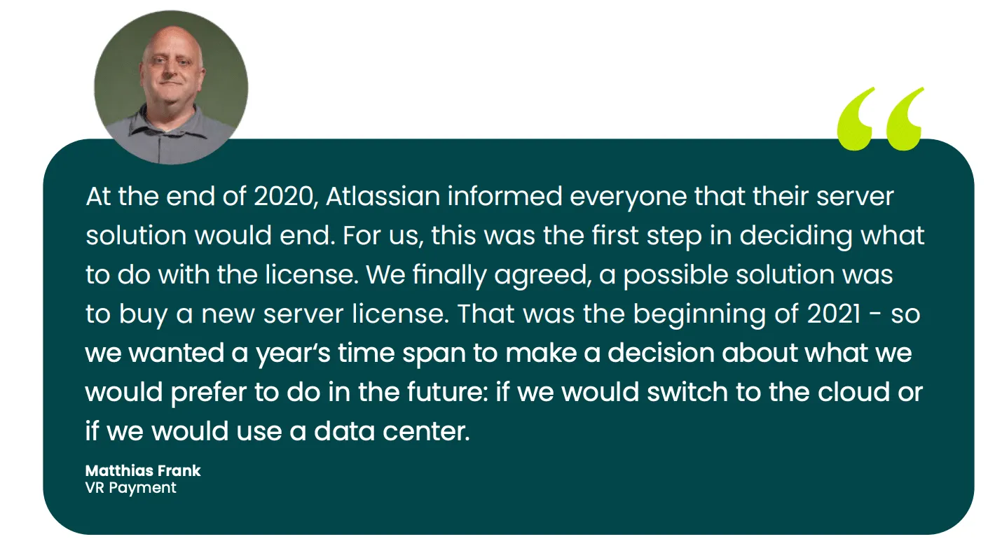 VR Payment, a payment service provider, employs approximately 350 staff members and has around 500 users of Atlassian products. In June 2021, the company migrated its server instances to the Atlassian Cloud, prompted by its announcement of ending server product support in February 2024. The migration process commenced in November 2021 and concluded in February 2022 ( Source: Seibert Solutions).