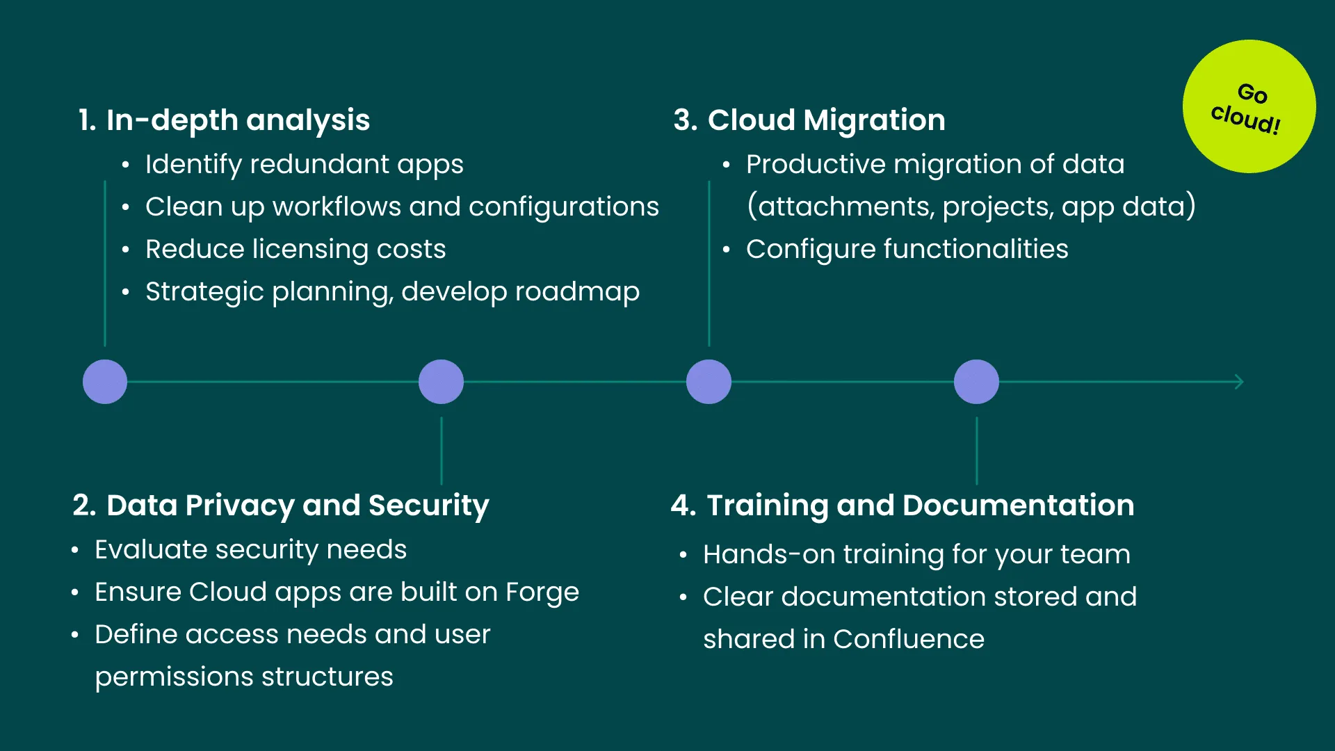 - In-depth Analysis: A thorough audit identifies redundant apps, duplicated configurations, outdated data, and structural issues in your Atlassian stack. This analysis serves as the starting point of our Jira cloud migration checklist, guiding your entire migration project.