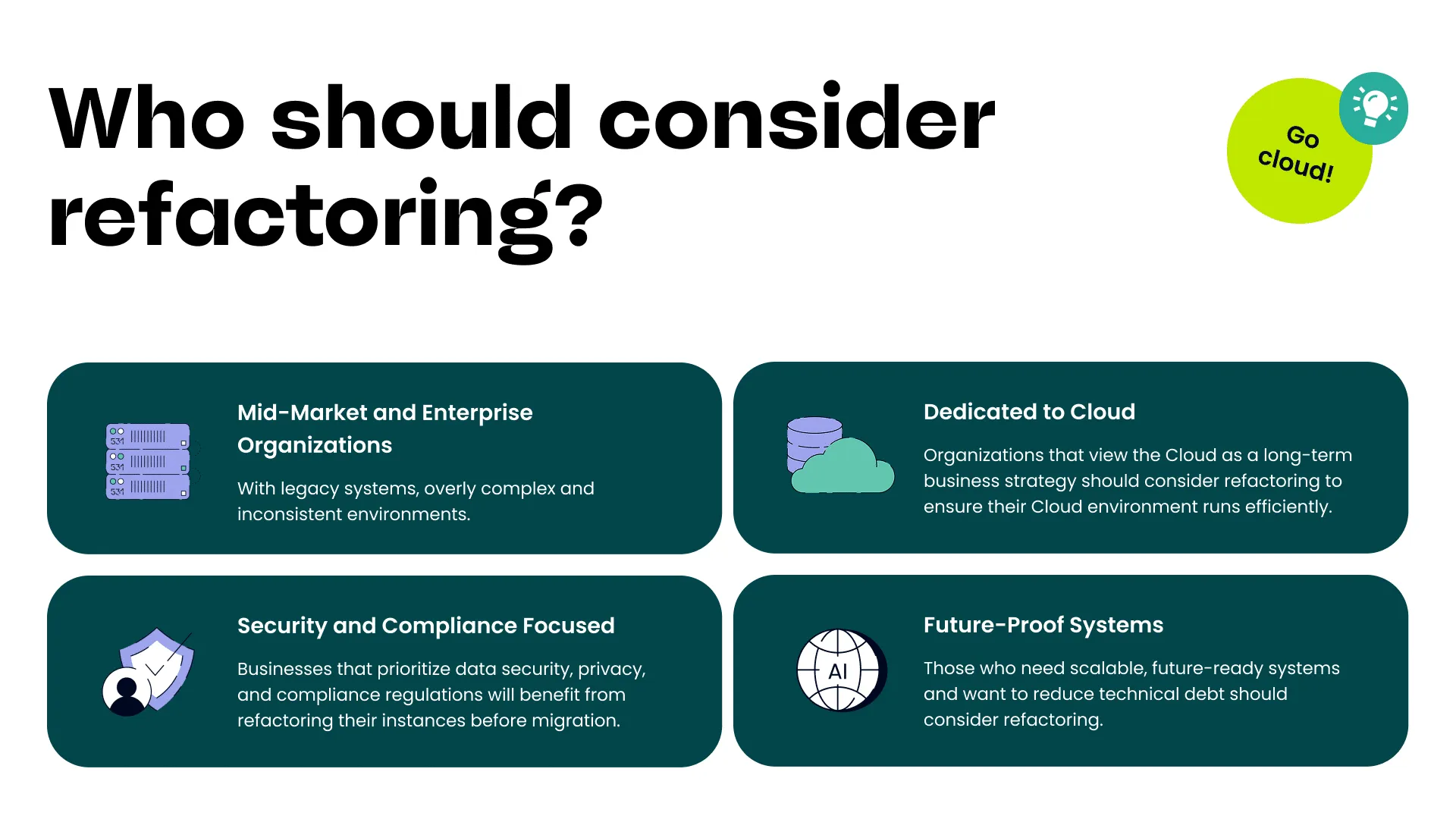 Refactoring is perfect for organizations facing legacy issues, app sprawl, and scalability challenges. It streamlines complex systems, improves performance, and aligns infrastructure with long-term cloud goals, making it a wise choice for companies preparing for growth and modernization.