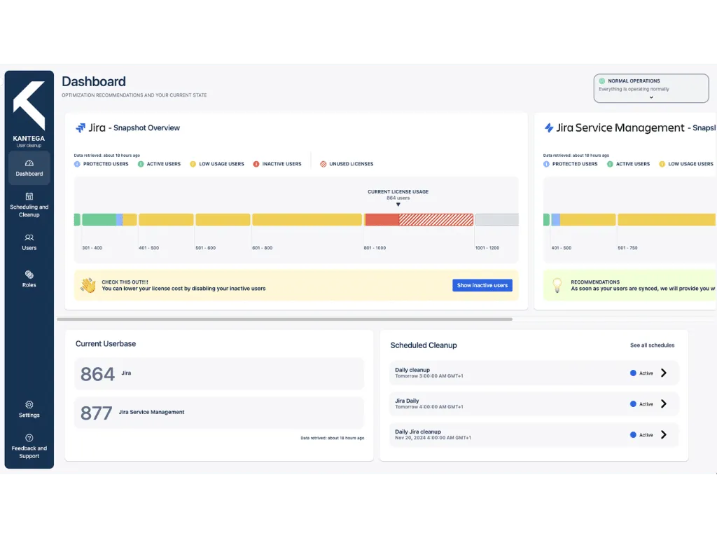 One way to begin understanding what your licensing landscape looks like is by trying out the Automated User Cleanup & Deactivation application for Jira, JSM and Confluence for Atlassian Cloud and Data Center. This application gives admins an overview of their company’s license consumption, activity vs. inactivity, and unused licenses, as well as options to cleanup and deactivate users and groups. It’s an easy way for admins to optimize their license base and off-boarding inactive users.